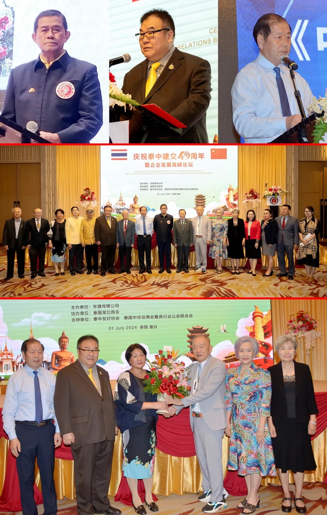 圖上:左起:泰中友好協(xié)會會長功,塔帕朗詩閣下致辭,泰國中華總商會副主席歐先梓致辭,湖北群藝集團董事長李榮致辭。