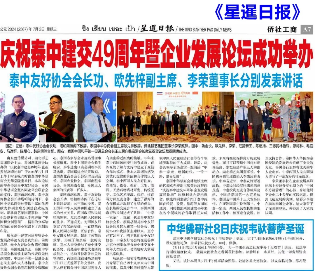 由東盟傳媒公司主辦、泰國湖北商會協(xié)辦的"慶祝泰中建交49周年企業(yè)發(fā)展高峰論壇"于2024年7月1日上午十時至晚六時在泰國中華總商會光華堂隆重舉行,本次論壇的舉辦得到泰中友好協(xié)會、泰國中華總商會暨各同業(yè)公會聯(lián)合會的支持,泰國前副總理、泰中友好協(xié)會會長功塔帕朗詩閣下、泰國中華總商會林楚欽主席的代表歐先梓副主席分別登臺致祝賀詞,湖北群藝集團董事長、中國積分制管理創(chuàng)始人李榮講解"中國積分制管理",精彩的分享給在場的泰國企業(yè)家留下了深刻的印象。