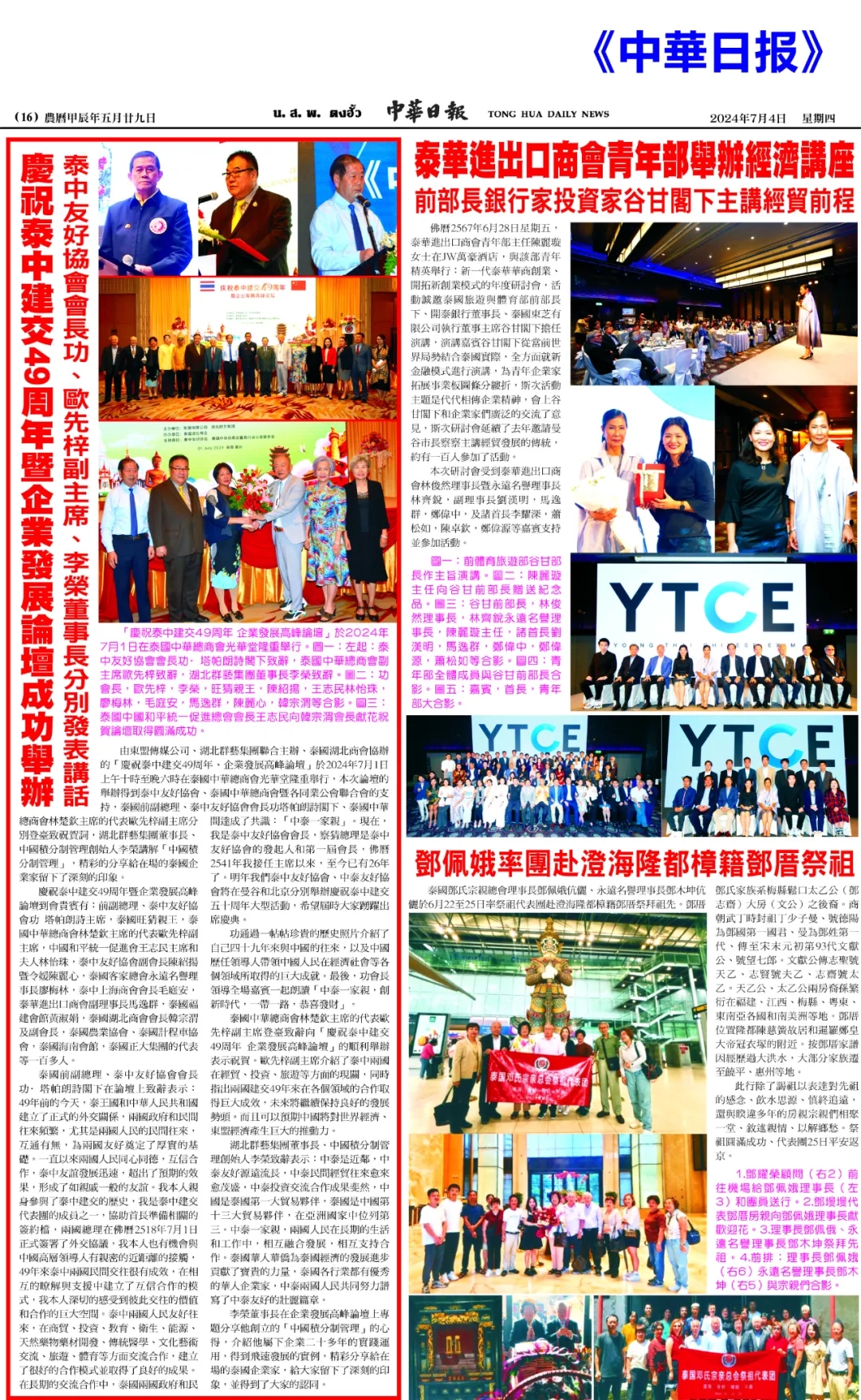 泰國前副總理、泰中友好協(xié)會會長功,塔帕朗詩閣下在論壇上致辭表示:49年前的今天,泰王國和中華人民共和國建立了正式的外交關(guān)系,兩國政府和民間往來頻繁,尤其是兩國人民的民間往來,互通有無,為兩國友好奠定了厚實的基礎(chǔ)。一直以來兩國人民同心同德,互信合作,泰中友誼發(fā)展迅速,超出預期的效果,形成了如親戚一般的友誼。我本人親身參與了泰中建交的歷史,我是泰中建交代表團的成員之一,協(xié)助首長準備相關(guān)的簽約檔,兩國總理在佛歷2518年7月1日正式簽署了外交協(xié)議,我本人也有機會與中國高層領(lǐng)導人有親密的近距離的接觸,49年來泰中兩國民間交往很有成效,在相互的了解與支持中建立了互信合作的模式,我本人深切的感受到彼此交往的價值和合作的巨大空間。泰中兩國人民友好往來,在商貿(mào)、投資、教育、衛(wèi)生、能源、天然藥物藥材開發(fā)、傳統(tǒng)醫(yī)學、文化藝術(shù)交流、旅游、體育等方面交流合作,建立了很好的合作模式并取得了良好的成果。在長期的交流合作中,泰國兩國政府和民間達成了共識:"中泰一家親"。現(xiàn)在,我是秦中友好協(xié)會會長,察猜總理是泰中友好協(xié)會的發(fā)起人和第一屆會長,佛歷2541年我接任主席以來,至今已有26年了。明年我們泰中友好協(xié)會、中泰友好協(xié)會將在曼谷和北京分別舉辦慶祝泰中建交五十周年大型活動,希望屆時大家踴躍出席慶典。