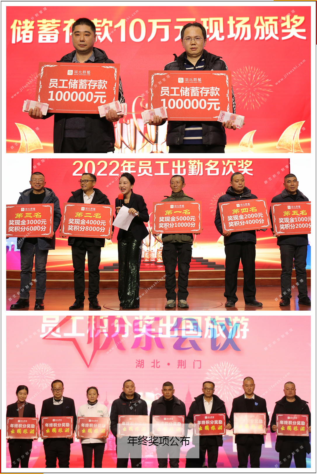 與此同時,本次快樂會議還現(xiàn)場頒發(fā)了2022年出勤名次獎前5名、2022年員工積分出國旅游、員工10萬元儲蓄存款的現(xiàn)金獎勵。